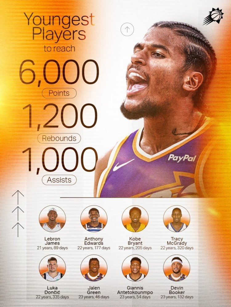 7月11日讯 太阳官方晒出一张关于“拿到6000分+1200篮板+1000助攻最年轻的8位球员”数据图,并配文写到:“跻身顶级行列。”