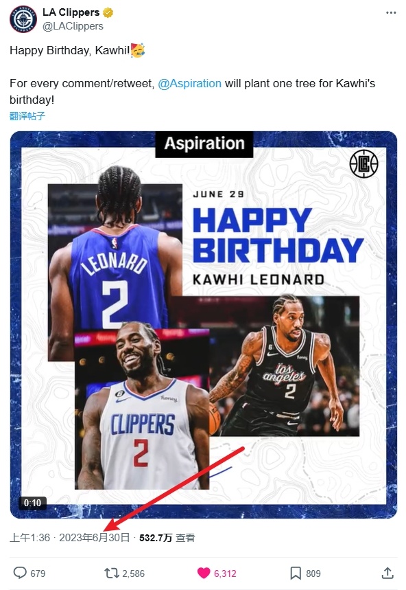 快船官推在2023年6月30日与Aspiration公司有过联动,祝贺莱昂纳德生日快乐;
