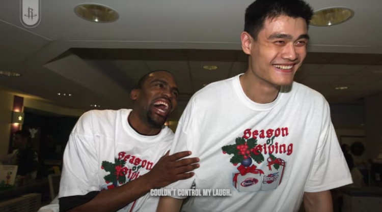 谈到姚明,莫布里说:“姚明会说,他很乐意我坐在旁边,尤其是当我就坐在他身边的时候,我太喜欢他的幽默感了。所以,比如我们在参加宴会、活动或者其他类似场合时,他会讲个笑话,或者拿某个人开个小玩笑,那些话对我来说实在太好笑了,我根本忍不住,总会直接笑喷。我就完全不顾形象地大笑。然后你看他反应——我就得捶他几下,又搂又抱地表达情绪。”