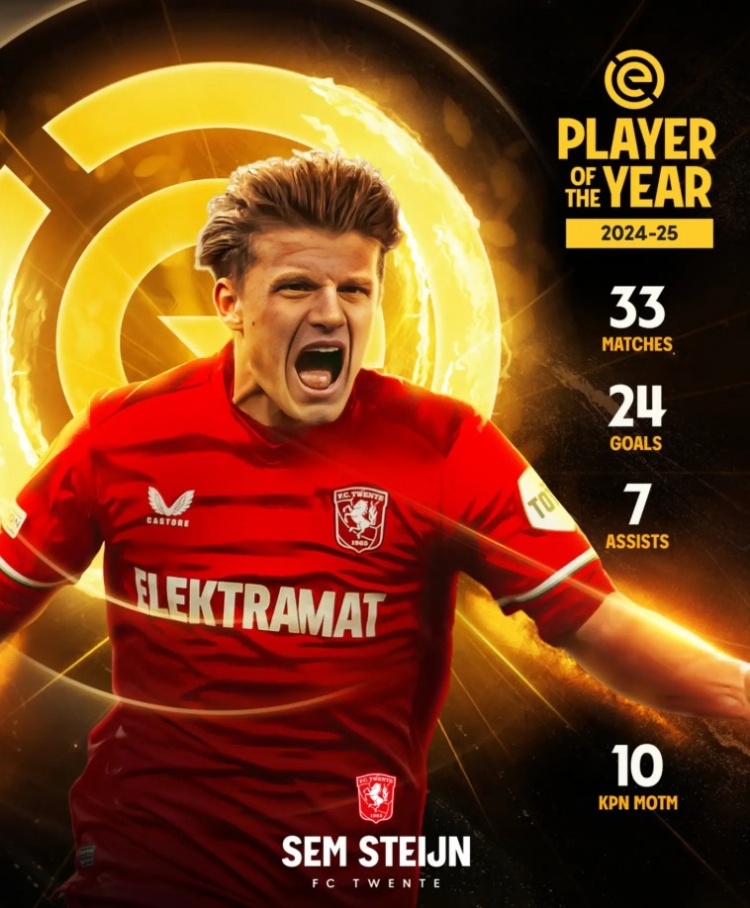 5月27日讯 近日,塞姆-施泰恩在荷甲颁奖典礼上荣获2024/25赛季荷甲最佳球员称号,这位23岁的特温特中场得到了18位队长的最多选票。