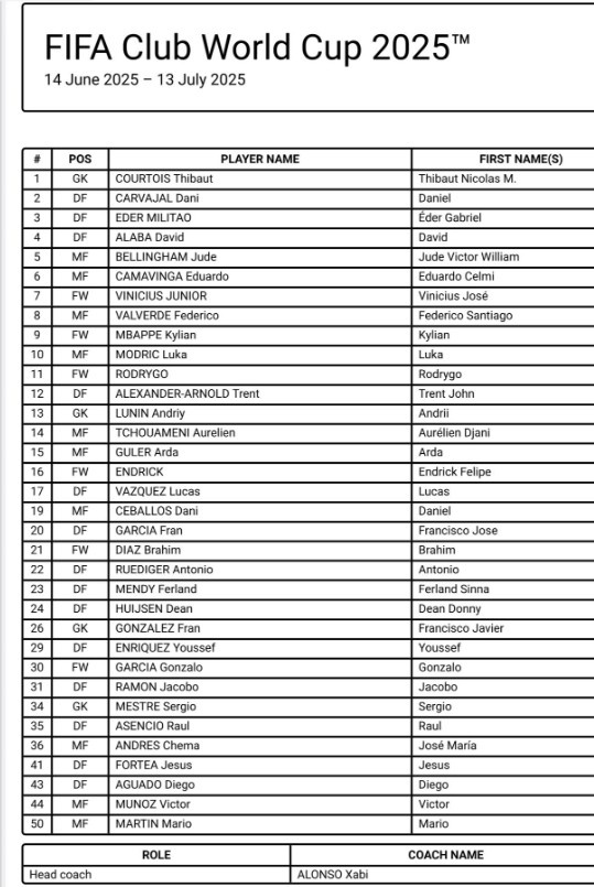 1-库尔图瓦、2-卡瓦哈尔、3-米利唐、4-阿拉巴、5-贝林厄姆、6-卡马文加、7-维尼修斯、8-巴尔韦德、9-姆巴佩、10-莫德里奇、11-罗德里戈、12-阿诺德、13-卢宁、14-琼阿梅尼、15-居勒尔、16-恩德里克、17-巴斯克斯、19-塞巴略斯、20-弗兰-加西亚、21-布拉希米-迪亚斯、22-吕迪格、23-费兰-门迪、24-怀森、26-弗兰-冈萨雷斯、29-尤素福-恩里克斯、30-贡萨洛-加西亚、31-雅各布-拉蒙、34-梅斯特雷、35-劳尔-阿森西奥、36-安德烈斯、41-弗尔特亚、43-阿瓜多、44-穆尼奥斯、50-马里奥-马丁