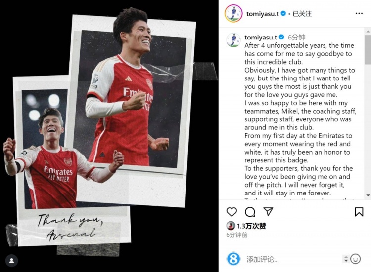 7月4日讯 富安健洋更新社媒动态,与阿森纳告别。