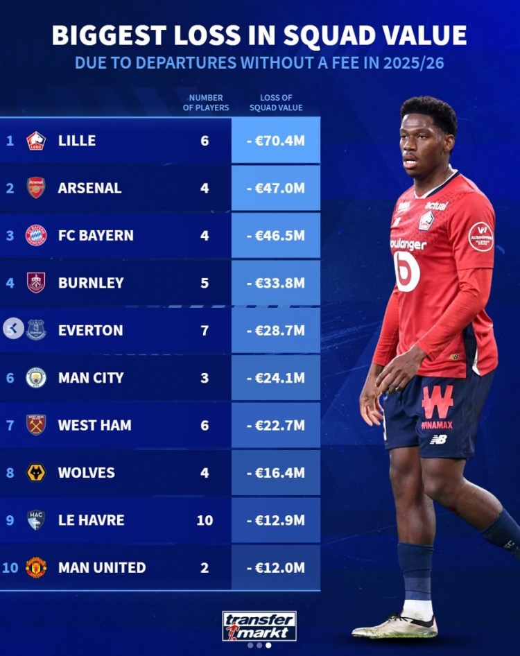 7月10日讯 《转会市场》统计了今夏因为球员自由身离队而身价损失情况,里尔、阿森纳、拜仁分列前三。