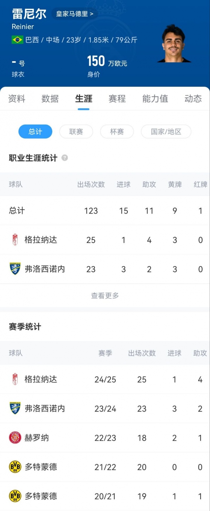 本赛季雷尼尔代表格拉纳达出战25场比赛,仅打入1球并送出4次助攻,他加盟皇马之后的第四次外租再度以失败告终。