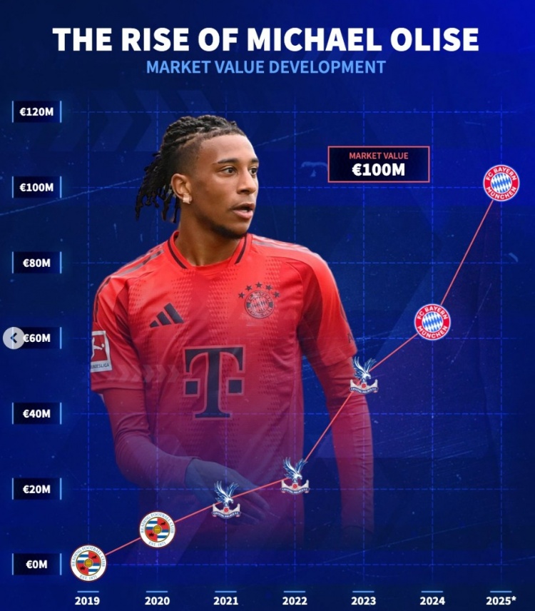 奥利塞出自切尔西青训,在2019年正式从雷丁出道,2020年身价涨到1500万欧元。加盟水晶宫后,他的身价在2022年稳定在2000万欧元浮动。但随着他在2023年开始持续高光,身价暴涨至5000万欧。而在加盟拜仁后,凭借其稳定而出色的发挥,当前已经涨至1亿欧元。