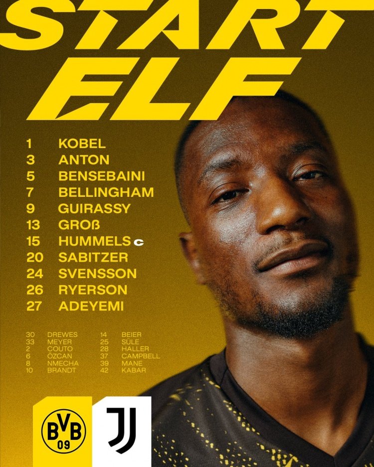 1-科贝尔、3-安东、5-本赛拜尼、7-小贝林厄姆、9-吉拉西、13-格罗斯、15-胡梅尔斯、20-萨比策、24-斯文松、26-莱尔森、27-阿德耶米