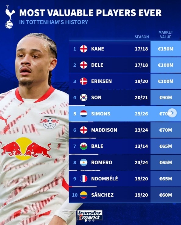 8月30日讯 本周五,热刺官方宣布以6000万欧元从莱比锡签下哈维-西蒙斯。根据德国转会市场提供的数据,西蒙斯的身价为7000万欧元,在热刺队史足以排在第5位。