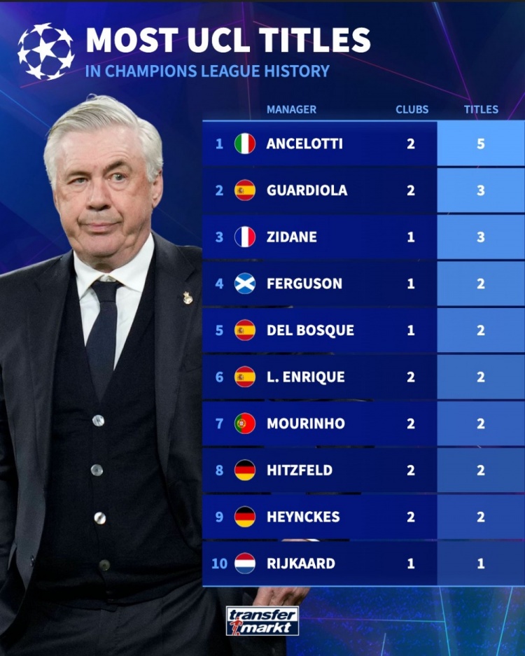 欧冠夺冠次数榜:教练安切洛蒂5冠居首,球员魔笛等5人斩获6冠