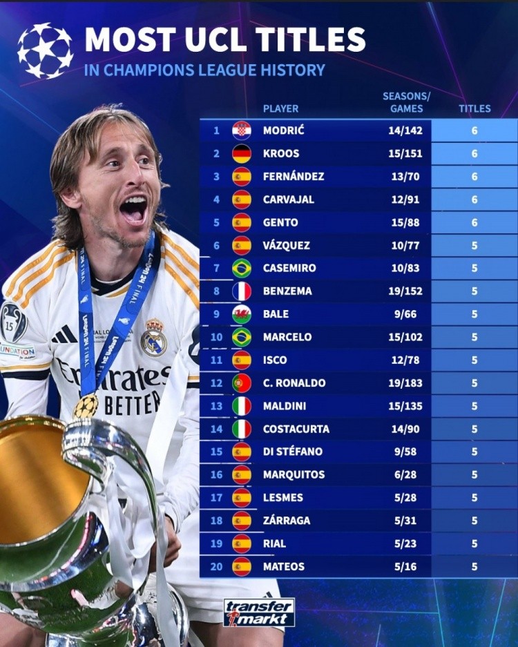 9月16日讯 德国转会市场统计了教练、球员夺得欧冠的次数,并分别列出榜单,教练之中安切洛蒂5冠居首,球员之中莫德里奇、克罗斯、纳乔、卡瓦哈尔、亨托6冠最多。