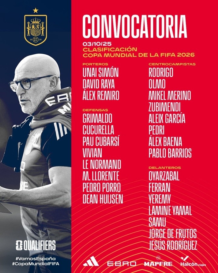 10月03日讯 西班牙队官方公布了最新一期的国家队大名单,亚马尔、佩德里领衔,苏维门迪、赫伊森等多人在列。卡瓦哈尔、费尔明等人因伤落选。这批球员将随西班牙出征10月份的两场世预赛欧洲区比赛。