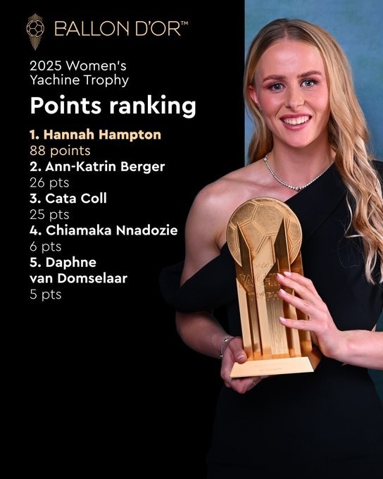 绝对统治力!女足雅辛奖投票详情:汉普顿88分断层第一,领先62分