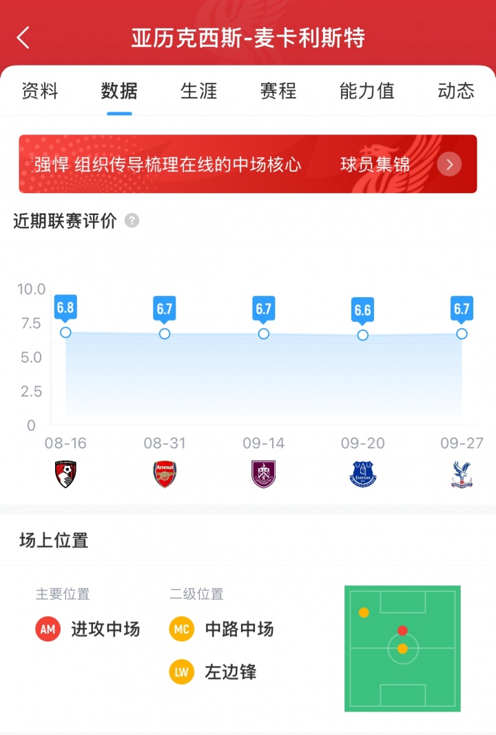 麦卡利斯特本赛季开赛后,表现平平。目前2个月来的英超比赛以及两场欧冠比赛没有一场媒体评分达到7分。